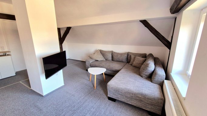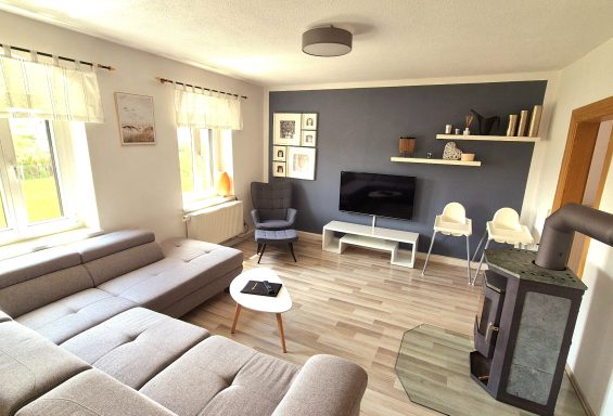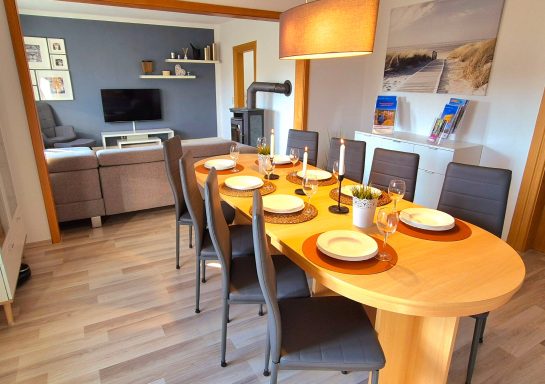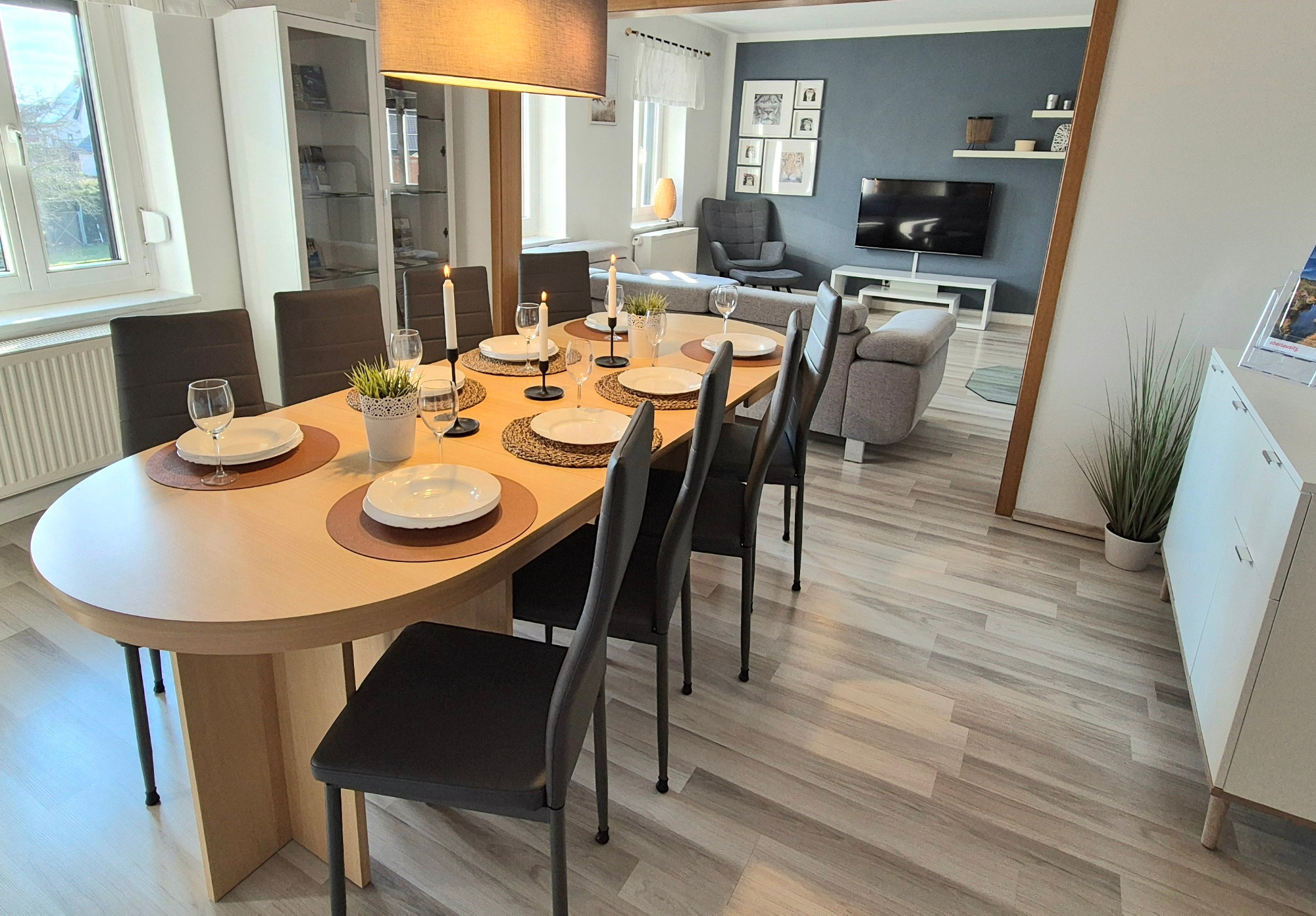 Smart-TV inkl. Netflix, Kamin, großer ausziehbarer Esstisch, Eckcouch mit Schlaffunktion, zwei Kinderhochstühle