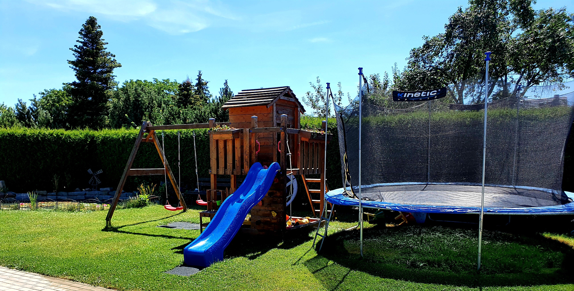 Terrasse, Grill, Sitzmöglichkeiten, Spielbereich, Trampolin, Sandkasten, Rutsche, Schaukel,zwei Parkplätze