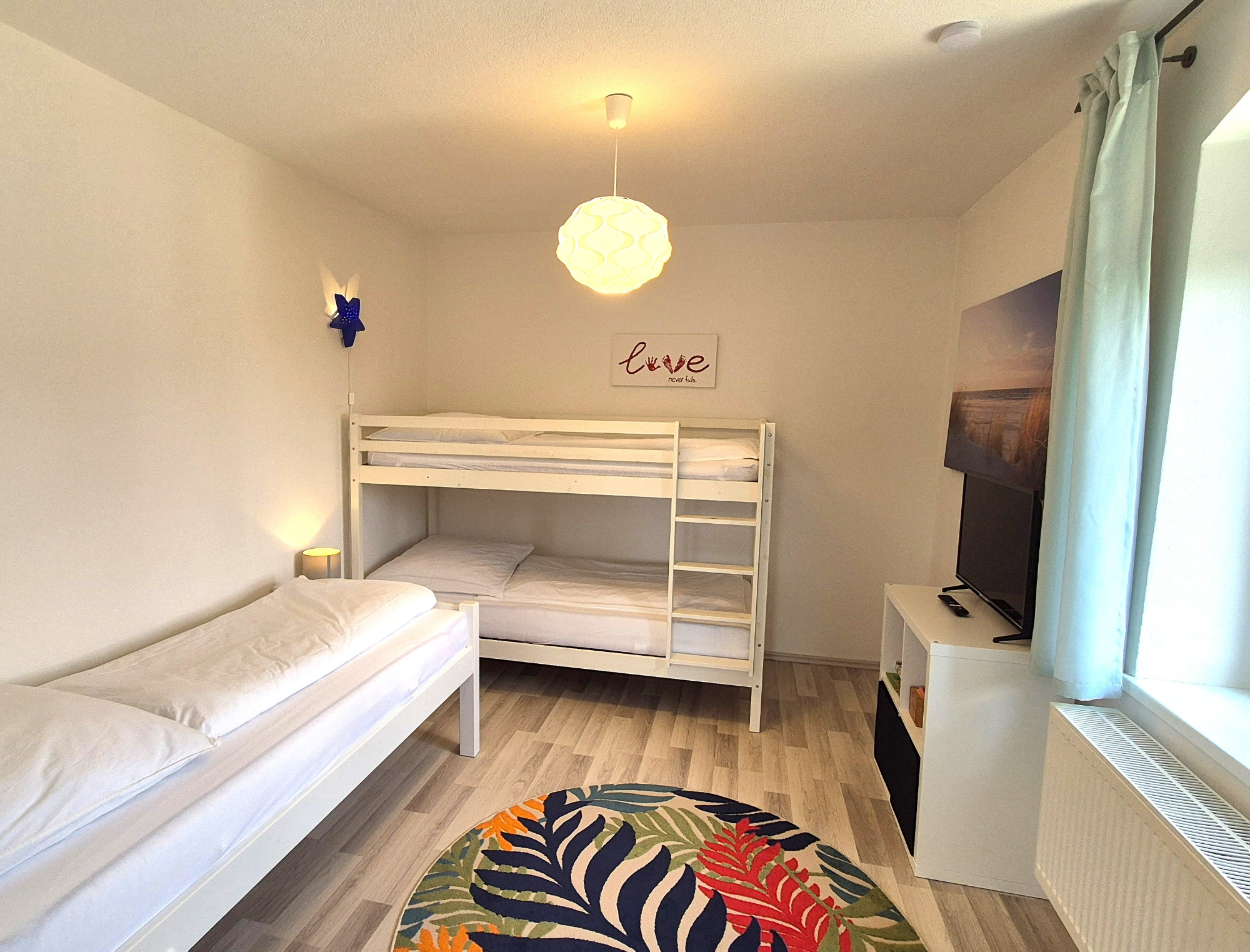 Etagenbett mit zwei Ebenen 0,90m*2,00m, 1 Einzelbett 0,90m*2,00m, Smart-TV, kleine Auswahl an Spielsachen